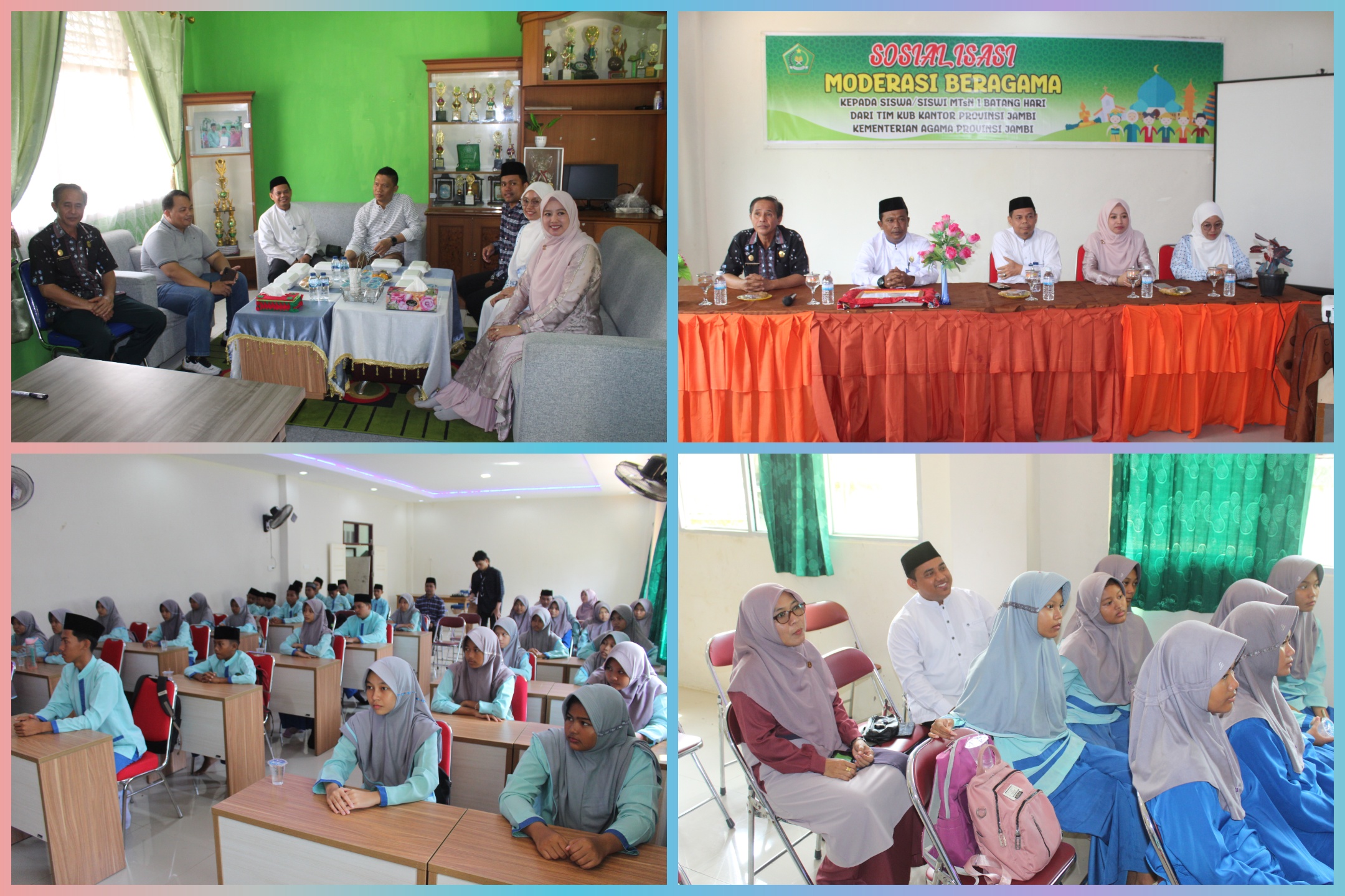 Muara Bulian, MTsN 1 (TIM Web) --- Siswa/ I MTsN 1 Batang Hari mengikuti Kegiatan Sosialisasi Moderasi Beragama oleh Kabag TU Kanwil Kemenag Provinsi Jambi Dr. H. Abdullah Saman, M.Pd.I dan Tim Kerukunan Umat Beragama (KUB) di Aula MTsN 1 Batang Hari Jum’at 11/10/2024. MTsN 1 Batang Hari menjadi satu-satunya Madrasah yang mendapat kunjungan serta Sosialisai Moderasi Beragama dari Tim KUB.