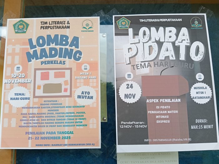 Dalam rangka menyemarakkan peringatan Hari Guru Nasional tahun 2025, Tim Literasi Siswa MTsN 1 Batanghari kembali menunjukkan kreativitas dan semangat literasinya. Pada Kamis (13/11), para anggota tim dengan penuh antusias menempelkan poster lomba pidato dan lomba mading antar kelas di berbagai sudut strategis madrasah.