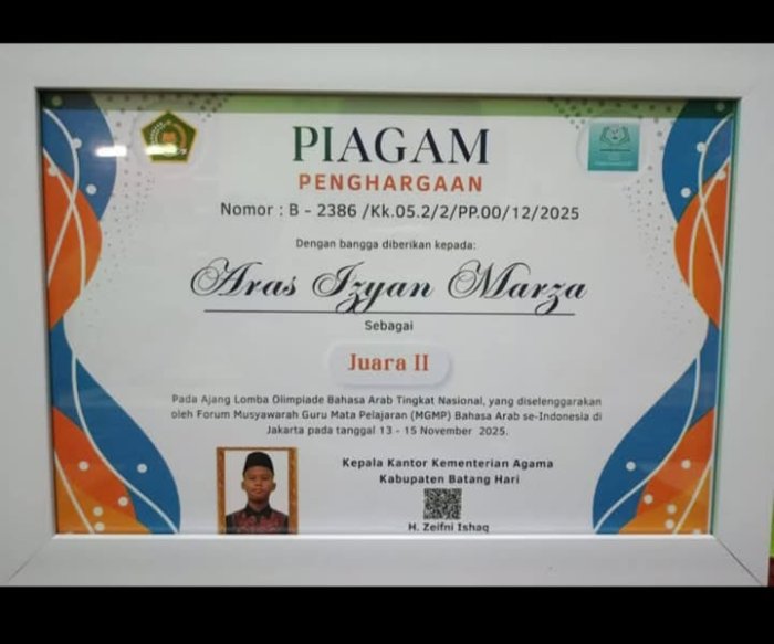 Muara Bulian,MTsN 1 (WEB) - Aras Jiyan Marza, siswa MTsN 1 Batang Hari, menerima penghargaan atas prestasinya sebagai peserta Olimpiade Bahasa Arab ke 8 Tingkat Nasional. Penghargaan tersebut diberikan langsung oleh Bupati Batang Hari, MHD Fadil Arief, dalam upacara peringatan Hari Amal Bakti (HAB) ke-80 Kementerian Agama Kabupaten Batang Hari.