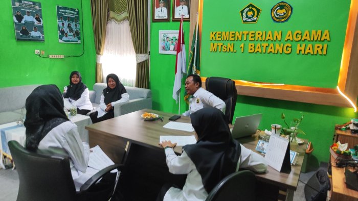Muara Bulian, MTsN 1 (TIM WEB) --- Dalam upaya meningkatkan kualitas manajerial dan efektivitas program kerja kesiswaan, Kepala Madrasah Tsanawiyah Negeri (MTsN) 1 Batang Hari, Bapak Doni Parizal, S.Pd., M.Pd., menggelar rapat koordinasi khusus bersama jajaran Pembina Organisasi Siswa Intra Madrasah (OSIM). Pertemuan ini berlangsung khidmat di ruang kerja kepala madrasah dengan agenda utama penguatan peran organisasi dalam mendukung visi misi madrasah. Senin (06/04).