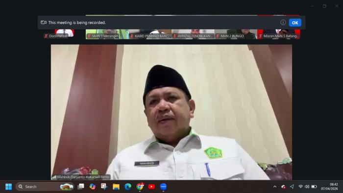 Muara Bulian, MTsN 1 (TIM WEB) --- Dalam upaya penguatan tata kelola tenaga pendidik, Kepala Madrasah Tsanawiyah Negeri (MTsN) 1 Batang Hari, Bapak Doni Parizal, S.Pd., M.Pd, didampingi Pelaksana Harian (PLH) Tata Usaha, Ibu Ria Fitriani, S.Pd.I, mengikuti kegiatan Finalisasi Data Pemetaan Beban Kerja Guru Pegawai Pemerintah dengan Perjanjian Kerja (PPPK) secara daring melalui aplikasi Zoom Meeting pada Selasa (07/04).