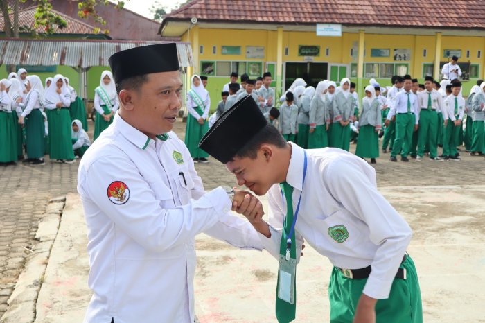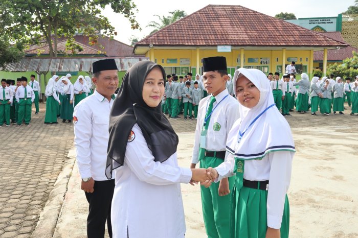 Di hadapan seluruh civitas akademika, Kepala MTsN 1 Batang Hari, Bapak Doni Parizal, S.Pd., M.Pd., dan ketua Panitia ASAS Ibu Arini Novria Wati, S.Sn., memanggil perwakilan siswa untuk maju ke depan barisan. Dengan penuh apresiasi, beliau menyematkan langsung ID Card peserta kepada perwakilan siswa tersebut.